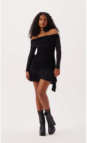 Vestido Mini Velvet Devorê Off The Shoulder - Preto